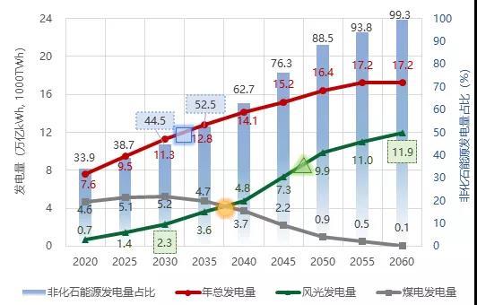 發(fā)電量方面,2030-2035年間非化石能源年發(fā)電量超過50%,形成非化石能源發(fā)電為主體的電力系統(tǒng);風(fēng)光發(fā)電量快速提升是非化石能源發(fā)電量占比提高的主要原因,2030年風(fēng)光發(fā)電量達(dá)到2.3萬億千瓦時,占總發(fā)電量20%;2035-2040年間風(fēng)光發(fā)電量開始超過煤電,之后煤電進(jìn)一步加速退役,風(fēng)光發(fā)電量在總發(fā)電量中占比加速提高,2045-2050年間超過50%,成為發(fā)電主體;2060年風(fēng)光發(fā)電量11.9萬億千瓦時,占總發(fā)電量69.2%,為構(gòu)建以新能源為主體的新型電力系統(tǒng)創(chuàng)造必要條件。