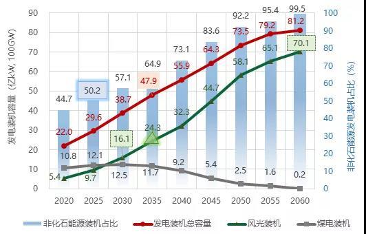 電力裝機方面,隨著風(fēng)光等新能源發(fā)電快速發(fā)展,非化石能源發(fā)電在電力裝機總量中的占比持續(xù)提高,“十四五”末將超過50%。風(fēng)光發(fā)電裝機不斷增加,2025-2030年間,風(fēng)光裝機總量超過煤電,2030年將達(dá)到16.1億千瓦,占裝機總量41.5%;2035年達(dá)到24.3億千瓦,超過電力裝機總量的50%,成為裝機主體;2060年達(dá)到70.1億千瓦,在電力裝機總量中的占比超過85%。