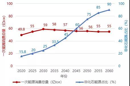 圖1 2020-2060年我國一次能源消費總量及非化石能源占比