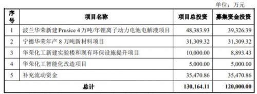 公司擬募資12億元投入波蘭華榮新建Prusice 4萬(wàn)噸/年鋰離子動(dòng)力電池電解液項(xiàng)目、寧德華榮年產(chǎn)8萬(wàn)噸新材料項(xiàng)目、華榮化工新建實(shí)驗(yàn)樓和現(xiàn)有環(huán)保設(shè)施提升項(xiàng)目、華榮化工智能化改造項(xiàng)目及補(bǔ)充流動(dòng)資金。