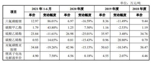 招股書(shū)顯示,今年上半年,公司六氟磷酸鋰的采購(gòu)單價(jià)為12.97萬(wàn)元/噸,漲幅為86.01%;碳酸甲乙酯的采購(gòu)單價(jià)為1.79元/噸,漲幅為43.8%。同期電解液的單價(jià)為4.9萬(wàn)元/噸,漲幅僅7.58%。