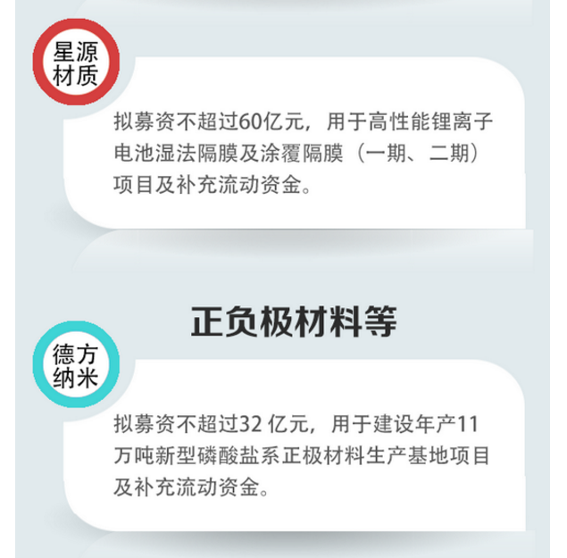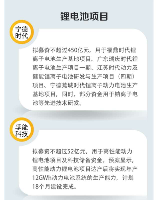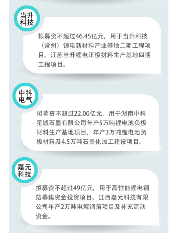 據(jù)中國證券報(bào)記者不完全統(tǒng)計(jì),2021年以來,鋰電上市公司密集發(fā)布定增預(yù)案,計(jì)劃募資總額近1360億元,用于擴(kuò)大產(chǎn)能、新技術(shù)研發(fā)等,涉及鋰礦、鋰電正極、負(fù)極、電解液等多個(gè)環(huán)節(jié)。