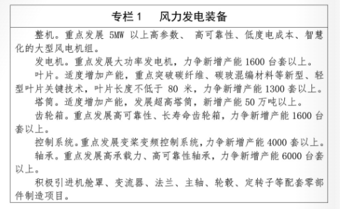 (一)風力發(fā)電裝備。加快現(xiàn)有產(chǎn)能升級改造,優(yōu)化產(chǎn)品結(jié)構(gòu),提升整機產(chǎn)能利用率。適度發(fā)展風電整機制造,重點發(fā)展葉片、發(fā)電機、增速機、輪轂、主軸、定轉(zhuǎn)子、法蘭、軸承、控制系統(tǒng)等核心配套零部件,提高零部件區(qū)內(nèi)配套能力,著力打造風電裝備制造全產(chǎn)業(yè)鏈基地,基本形成與自治區(qū)新增新能源裝機規(guī)模相匹配的風電裝備生產(chǎn)能力,努力建設(shè)我國北方重要的風力發(fā)電裝備制造基地。
