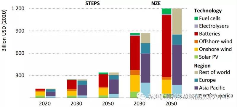 圖1 2020-2050年按技術(shù)類別和地區(qū)劃分的清潔能源技術(shù)市場規(guī)模(單位:十億美元)