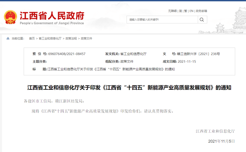 江西省工業(yè)和信息化廳關(guān)于印發(fā)《江西省“十四五”新能源產(chǎn)業(yè)高質(zhì)量發(fā)展規(guī)劃》的通知