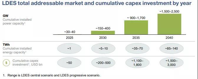 l 長時儲能的部署勢頭日益強勁,在過去五年中,長時儲能技術(shù)公司的投資約為30億美元,預(yù)計到2025年,全球部署長時儲能的容量將達到25-35GW/1TWh,投資約為500億美元。