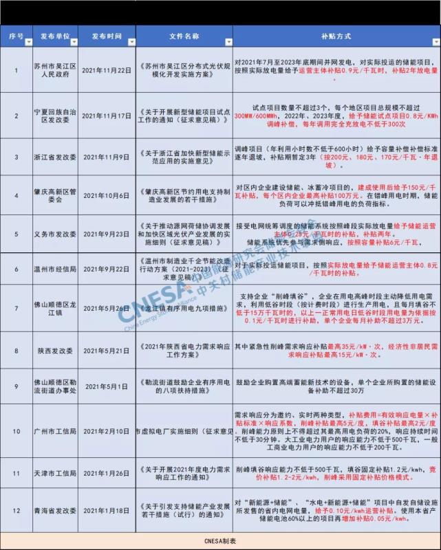 附:2021年儲(chǔ)能直接補(bǔ)貼政策梳理