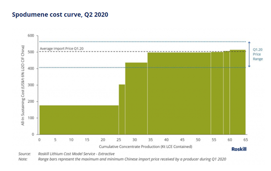 據(jù)鋰資源研究機構Roskill官網(wǎng),2020年二季度全球鋰輝石(6%鋰精礦)成本曲線在200美元/噸至500美元/噸左右的區(qū)間。