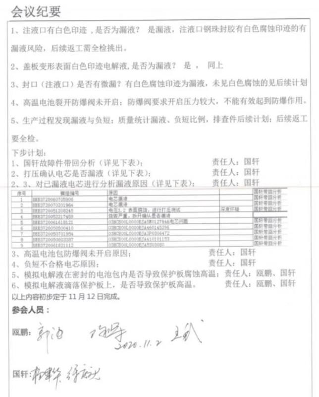 ▲會議紀(jì)要顯示國軒高科電芯存在漏液、防爆閥未開啟等問題 圖源:甌鵬動力