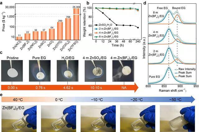 項(xiàng)目團(tuán)隊(duì)研發(fā)出了由水合四氟硼酸鋅鹽和乙二醇溶劑組成的新型電解液。作為阻燃劑的水合四氟硼酸鋅鹽賦予了電解液優(yōu)異的不可燃特性。乙二醇的高沸點(diǎn)及其與鹽中的水分子和四氟硼酸根陰離子間形成的豐富氫鍵網(wǎng)絡(luò)使電解液兼具難揮發(fā)和寬溫域(30℃ ~40℃)的特點(diǎn)。與此同時(shí),水合四氟硼酸鋅鹽解離出的四氟硼酸根陰離子和水分子會(huì)進(jìn)一步與金屬鋅發(fā)生反應(yīng),在鋅負(fù)極表面原位形成氟化鋅固態(tài)電解質(zhì)界面層,有效地保護(hù)了金屬鋅負(fù)極,避免了由于鋅枝晶刺穿隔膜以及鋅與電解液間的腐蝕副反應(yīng)導(dǎo)致的電池過(guò)早失效。