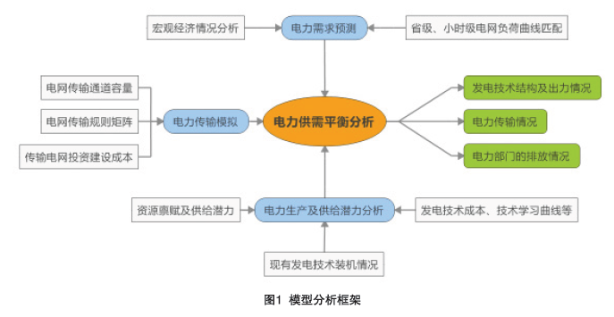 根據(jù)電力行業(yè)特點(diǎn),模型的分析框架包含電力需求模塊、電力生產(chǎn)模塊以及電力傳輸模塊三大部分(圖1)。電力需求模塊根據(jù)人口、產(chǎn)業(yè)、技術(shù)、城鎮(zhèn)化水平等宏觀經(jīng)濟(jì)分析數(shù)據(jù),結(jié)合省級(jí)電網(wǎng)負(fù)荷曲線展望未來省級(jí)區(qū)域分部門的用電需求結(jié)構(gòu)及趨勢。電力生產(chǎn)是模型分析的核心,以小時(shí)級(jí)的時(shí)間尺度為分析基礎(chǔ),詳細(xì)描述32個(gè)省級(jí)區(qū)域的18種發(fā)電技術(shù)組合,分析各省級(jí)區(qū)域的發(fā)電技術(shù)裝機(jī)結(jié)構(gòu)及發(fā)展趨勢,各發(fā)電技術(shù)的出力及發(fā)電順序等。電力傳輸模塊主要關(guān)注未來區(qū)域間電力傳輸通道的投資建設(shè)成本,以及省級(jí)和大電網(wǎng)區(qū)域間的電力傳輸規(guī)則、傳輸通道容量等。核心分析在于省級(jí)區(qū)域電網(wǎng)傳輸規(guī)則矩陣構(gòu)建,輸出電力傳輸約束條件。