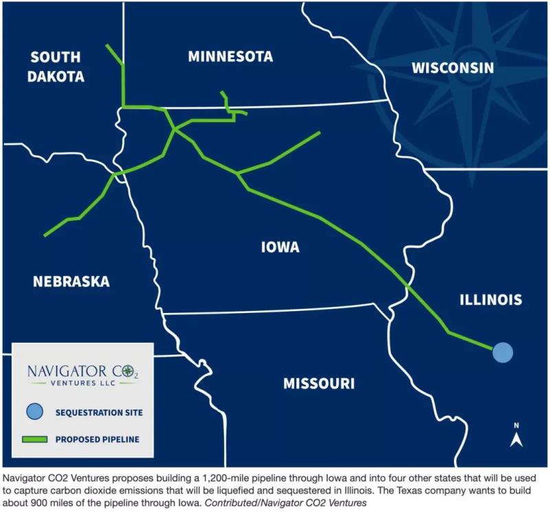 總部位于德克薩斯州的Navigator CO2公司稱其項目為Heartland Greenway System(“腹地綠道系統(tǒng)”),計劃在愛荷華州的36個縣修建約900英里的管道,并延伸到伊利諾斯州、內(nèi)布拉斯加州、明尼蘇達(dá)州和南達(dá)科他州,管道總長度1300英里。Summit公司表示將從31家生物燃料工廠捕集和封存碳;Navigator已與20家乙醇和化肥廠達(dá)成碳捕集和封存協(xié)議。