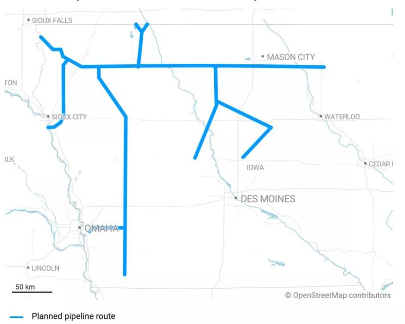 Summit公司的管道項目稱為 “中西部碳快車”(Midwest Carbon Express),建議在愛荷華州99個縣中的30個縣修建近710英里的管道,并延伸至另外四個州:明尼蘇達(dá)州、北達(dá)科他州、南達(dá)科他州和內(nèi)布拉斯加州,管道總長將達(dá)2000英里。