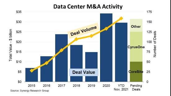 據(jù)Synergy研究統(tǒng)計,截至2021年11月中旬,今年已完成的數(shù)據(jù)中心并購交易總數(shù)已遠遠超過去年的創(chuàng)紀錄數(shù)量。雖然今年迄今為止完成的交易總價值尚未達到2020年的水平,但如果CoreSite的收購在年底前正式完成,2021年的交易價值至少比去年高出16%。而且由于還有幾項交易已達成一致但正在等待正式結束,因此2021年的最終數(shù)字可能會更高。