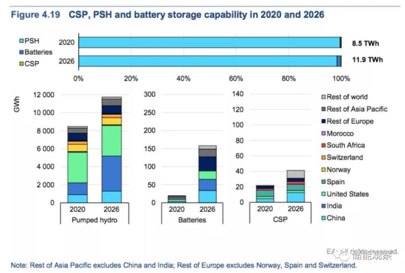 安裝量的增長(zhǎng)并不能完全展示每種儲(chǔ)能技術(shù)的全貌,目前來看,抽水蓄能和CSP儲(chǔ)能可以有效地提供中期存儲(chǔ)能力。通常情況下,CSP儲(chǔ)能時(shí)間在5-15小時(shí)。相比之下,最廣泛使用的鋰離子電池技術(shù)通??梢源鎯?chǔ)不到4小時(shí)的電力。