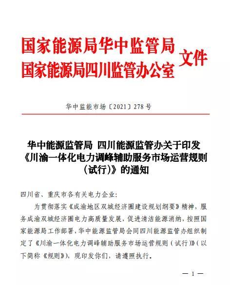 據(jù)此,華中能源監(jiān)管局積極落實(shí)中央和國家能源局決策部署,結(jié)合川渝電力一體化發(fā)展新形勢(shì),會(huì)同四川能源監(jiān)管辦組織川渝地區(qū)相關(guān)電力企業(yè)及時(shí)制訂了《川渝一體化電力調(diào)峰輔助服務(wù)市場(chǎng)運(yùn)營規(guī)則(試行)》。