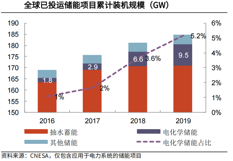 截至2020年底的數(shù)據(jù)顯示,全球已投運儲能項目累計裝機規(guī)模 191.1GW。其中,抽水蓄能的累計裝機規(guī)模為 172.5GW,電化學(xué)儲能為14.2GW。電化學(xué)儲能占比相較此前有所擴大,但占整體比重仍沒有超過10%。