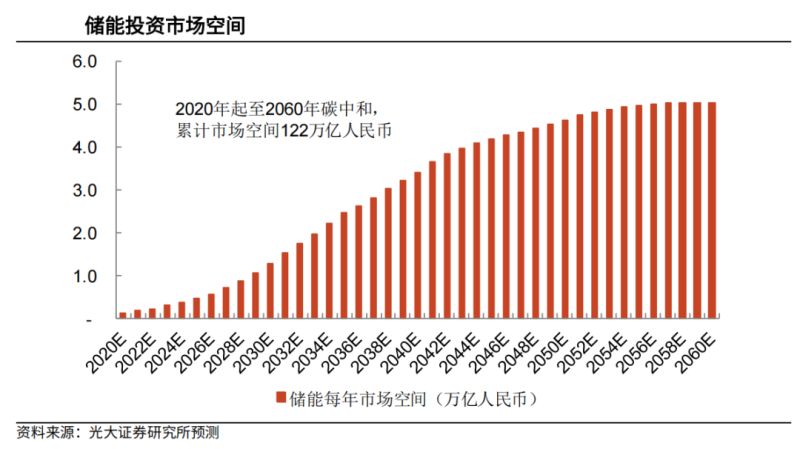《每日經(jīng)濟新聞》記者注意到,目前市場普遍對儲能發(fā)展的前景相當(dāng)看好。光大證券測算稱,2030年儲能需求空間可達到1.25Twh(億千瓦時),2020年-2030年累計3.9TWh.2030年儲能市場空間有望達到1.3萬億元,到2060年有望達到5萬億元。