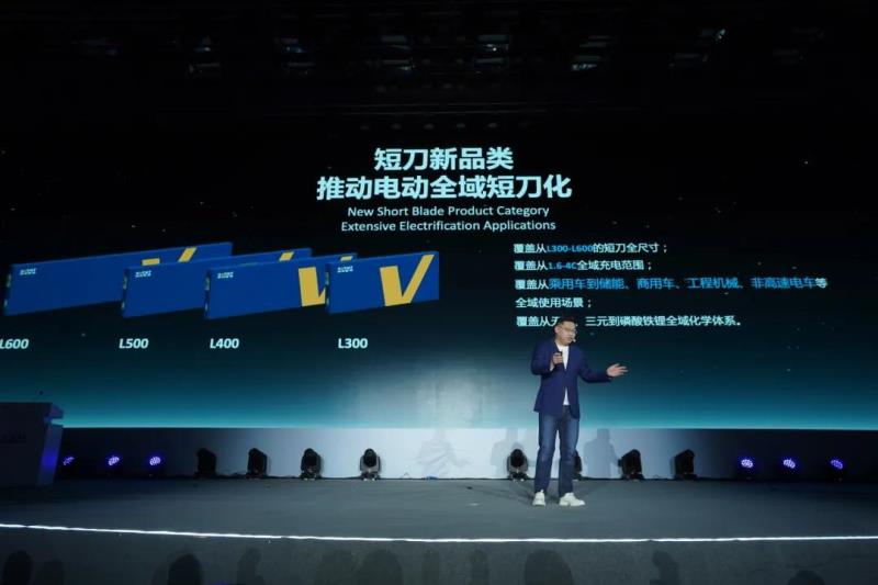 全域短刀化將涵蓋從L300-L600的全尺寸短刀電池產(chǎn)品,覆蓋從1.6-4C全域充電范圍,覆蓋從乘用車到儲能、商用車、工程機械、非高速電車等全域使用場景,覆蓋從無鈷、三元到磷酸鐵鋰全域化學體系。