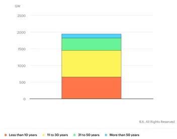 圖1 按在運(yùn)電廠服役壽命劃分的全球剩余煤炭產(chǎn)能分布(2021年)