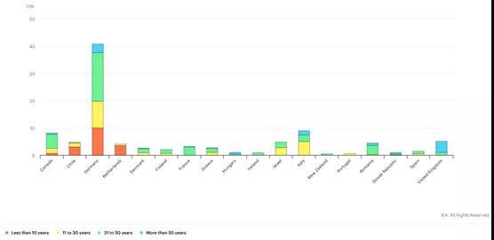 圖二 部分國(guó)家按在運(yùn)電廠服役壽命劃分的剩余煤炭產(chǎn)能分布(2021)