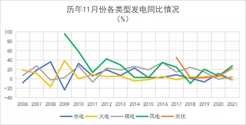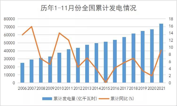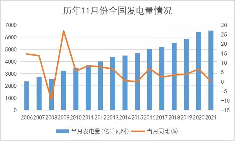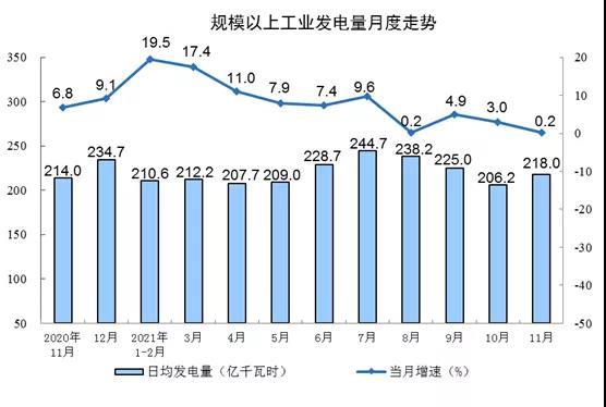 電力生產(chǎn)增速繼續(xù)回落。11月份,發(fā)電6540億千瓦時,同比增長0.2%,增速比上月回落2.8個百分點,比2019年同期增長7.0%,兩年平均增長3.5%,日均發(fā)電218億千瓦時。1—11月份,發(fā)電73827億千瓦時,同比增長9.2%,比2019年同期增長11.3%,兩年平均增長5.5%。