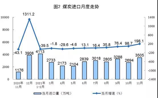 1—11月份,生產(chǎn)原煤36.7億噸,同比增長4.2%,比2019年同期增長4.6%,兩年平均增長2.3%;進(jìn)口煤炭2.9億噸,同比增長10.6%。