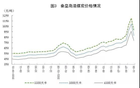 11月26日,秦皇島港5500大卡、5000大卡和4500大卡動力煤綜合交易價格分別為每噸986元、891元和792元,比10月29日分別回落216元、205元和169元。
