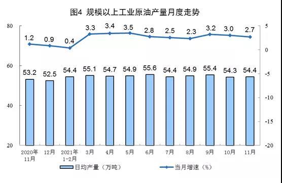 原油生產(chǎn)基本平穩(wěn),加工量由降轉(zhuǎn)增。11月份,生產(chǎn)原油1631萬噸,同比增長2.7%,增速比上月放緩0.3個百分點,比2019年同期增長3.9%,兩年平均增長1.9%,日均產(chǎn)量54.4萬噸;加工原油5964萬噸,同比增長2.2%,增速由負(fù)轉(zhuǎn)正,上月為下降3.0%,比2019年同期增長5.5%,兩年平均增長2.7%,日均加工198.8萬噸。
