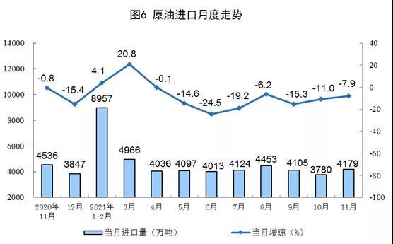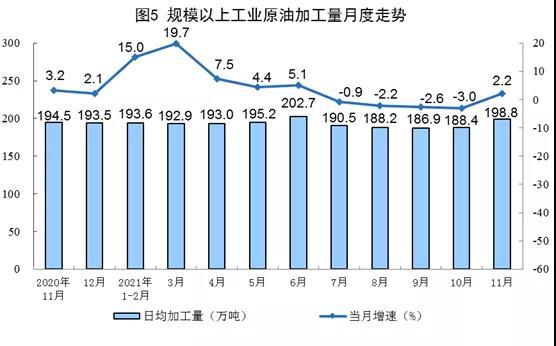1—11月份,生產(chǎn)原油18248萬噸,同比增長2.5%,比2019年同期增長4.2%,兩年平均增長2.1%;加工原油64479萬噸,同比增長4.9%,比2019年同期增長8.2%,兩年平均增長4.0%。