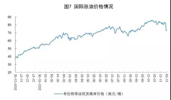 原油進(jìn)口降幅收窄,國際原油價格下跌。11月份,進(jìn)口原油4179萬噸,同比下降7.9%,降幅比上月收窄3.1個百分點;1—11月份,進(jìn)口原油46684萬噸,同比下降7.3%。11月29日,布倫特原油現(xiàn)貨離岸價格為73.3美元/桶,比10月29日下跌11.7%。