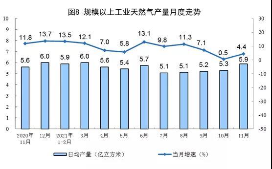 天然氣生產(chǎn)加快。11月份,生產(chǎn)天然氣177億立方米,同比增長4.4%,增速比上月加快3.9個百分點,比2019年同期增長16.7%,兩年平均增長8.0%,日均產(chǎn)量5.9億立方米。
