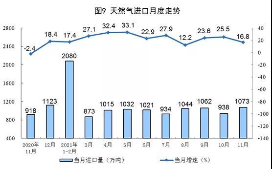 天然氣進(jìn)口有所放緩。11月份,進(jìn)口天然氣1073萬噸,同比增長16.8%,增速比上月放緩8.7個百分點。1—11月份,進(jìn)口天然氣10976萬噸,同比增長21.8%。