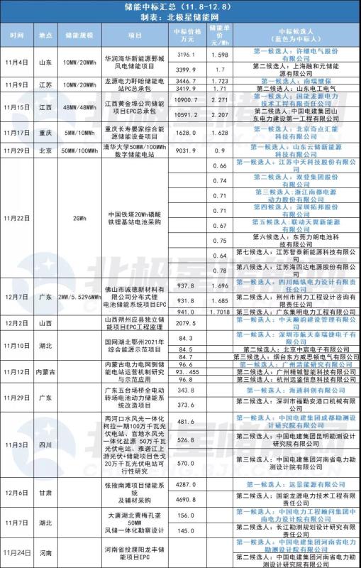 11月15日,國(guó)能黃金埠發(fā)電有限公司發(fā)布江西黃金埠公司儲(chǔ)能項(xiàng)目EPC總承包中標(biāo)候選人公示,第一候選人為國(guó)能龍?jiān)措娏夹g(shù)工程有限責(zé)任公司,投標(biāo)報(bào)價(jià)單價(jià)約2.271元/Wh,第二候選人中國(guó)電建集團(tuán)山東電力建設(shè)第一工程有限公司,報(bào)價(jià)單價(jià)約2.207元/Wh。