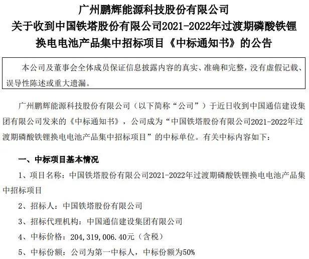 公告提到,鵬輝能源中標中國鐵塔股份有限公司2021-2022年過渡期磷酸鐵鋰換電電池產品集中招標項目,中標價格2.04億元,公司為第一中標人,中標份額為50%。