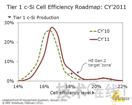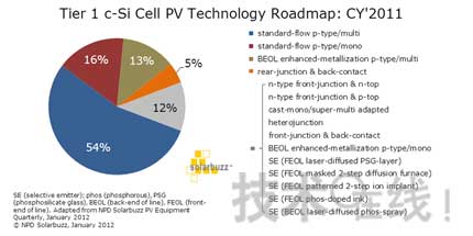 圖1 一線晶硅電池廠商2011年光伏技術(shù)路線圖(來(lái)源:NPD Solarbuzz)