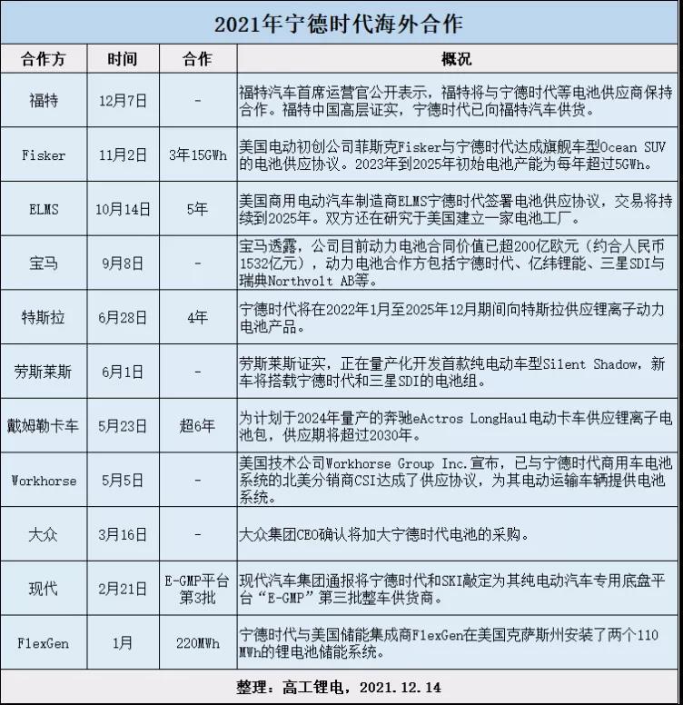 高工鋰電統(tǒng)計(jì),今年以來,寧德時代已與現(xiàn)代、大眾、戴姆勒卡車、勞斯萊斯、特斯拉、寶馬、菲斯克等國際車企傳出合作及加大合作的消息。