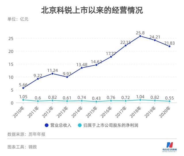 上市十多年,北京科銳的核心業(yè)務一直都是配電設備制造。然而,“聚焦主業(yè)”并未給北京科銳帶來持續(xù)的高增長。2010年至2019年,其歸屬于上市公司股東的凈利潤的年均增長率僅為1.64%,最高峰時也只有1.04億元。盤子小、步子慢,碰到增長“天花板”的北京科銳開始找出路。
