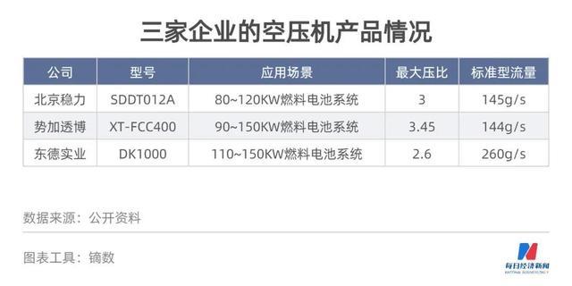不過,同上述三家企業(yè)的空壓機產(chǎn)品相比,北京穩(wěn)力的產(chǎn)品在這兩個指標上并無壓倒性優(yōu)勢。具體而言,北京穩(wěn)力空壓機(型號SDDT012A)的應用場景為80~120KW燃料電池系統(tǒng),最大壓比是3.0,最大流量是145g/s。勢加透博空壓機(型號XT-FCC400)的應用場景為90~150KW燃料電池系統(tǒng),最大壓比為3.45,標準型流量為144g/s。東德實業(yè)空壓機(型號DK1000)的應用場景為110~150KW燃料電池系統(tǒng),在壓比為2.6的條件下,出口流量最大可達到260g/s。