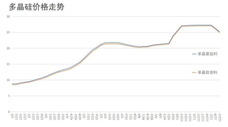 8月中旬,硅料開啟了第二階段的漲價(jià)潮。此后,經(jīng)歷了連續(xù)十二周的連漲,單晶復(fù)投料和單晶致密料分別從20.53萬元/噸和20.32萬元/噸升至27.22萬元/噸26.99萬元/噸的峰谷,且超過一個(gè)月保持在該高位不見松動(dòng)。