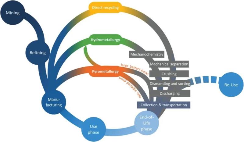 電池回收工藝可以減少資源需求以及對(duì)生態(tài)的破壞。目前,回收工藝可分為火法冶金和濕法冶金。圖7顯示了現(xiàn)有回收過程。