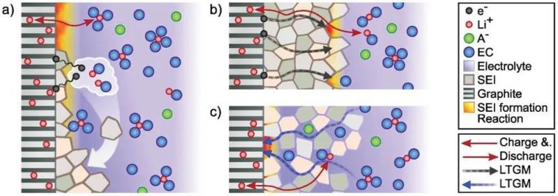 【圖5】a)初始SEI形成:電子隧穿,電解質(zhì)被還原,還原產(chǎn)物沉積為固態(tài)薄膜。b)通過將負(fù)電荷傳輸?shù)絊EI/電解質(zhì)界面c)或電解質(zhì)向電解質(zhì)/SEI界面擴(kuò)散引起的SEI增長。