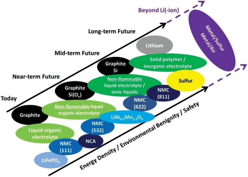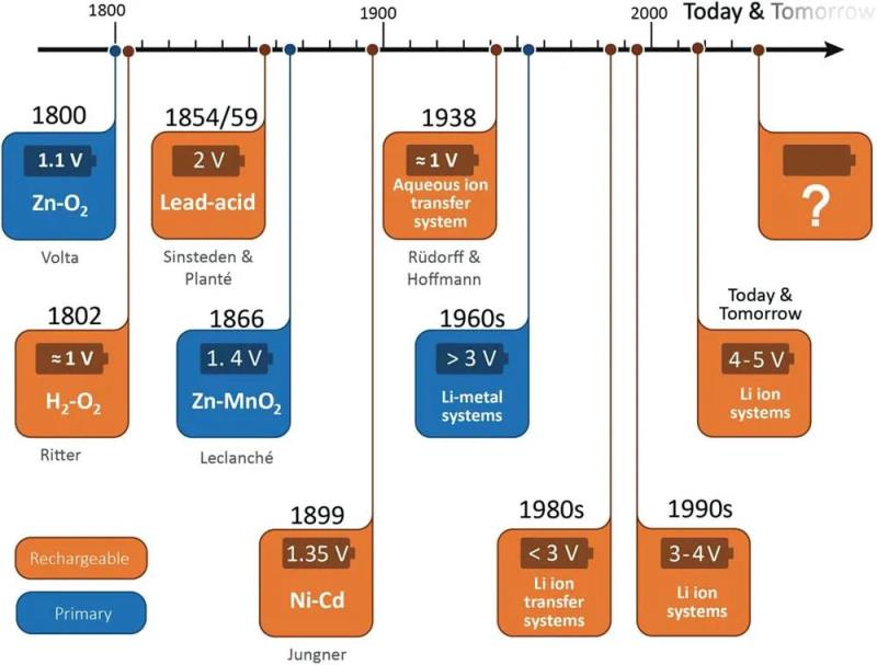 18世紀(jì),亞歷山德羅·沃爾塔(Alessandro Volta)首次建造了電池“堆”,由交替的陰極和陽極層組成,薄紙當(dāng)隔膜并由電解質(zhì)連接,構(gòu)成了現(xiàn)代電池的雛形。在19和20世紀(jì),一系列可充電(二次)和不可充電(一次)電池的開發(fā)層出不窮。其中,鉛酸電池是一個(gè)重大突破。直到今天,鉛酸電池仍占據(jù)電池市場的主要份額。20世紀(jì)下半葉,消費(fèi)類應(yīng)用對(duì)電池的需求增加,這些電池具有更長的運(yùn)行時(shí)間、更小的尺寸、更輕的重量、高安全性和低成本。自1960年代以來,人們開發(fā)了迄今為止最成功的電池:鋰電池。第一個(gè)鋰電池負(fù)極使用金屬鋰,但存在嚴(yán)重的枝晶問題。自1980年代后期以來,鋰金屬被石墨取代,石墨可以安全地脫插嵌鋰離子(即“鋰離子電池”)。但是,這種導(dǎo)致電池的能量密度顯著降低。第一個(gè)正極材料是層狀化合物TiS2,它的電位相對(duì)較低,且容量中等。而層狀過渡金屬氧化物(如CoO2)由于氧與鋰的相互作用更強(qiáng),且堆積密度更高,具有更高的電位和容量。第一個(gè)商用鋰離子電池于1990年代初由索尼公司制造并銷售。自進(jìn)入市場以來,鋰離子電池的能量密度提高了三到四倍,而價(jià)格卻下降了18倍。
