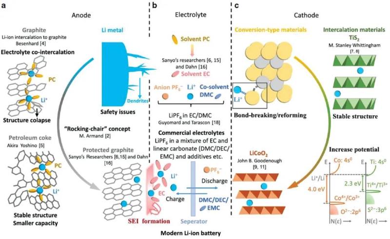 【圖2】現(xiàn)代鋰離子電池的里程碑發(fā)現(xiàn)。a)負(fù)極材料開發(fā),包括鋰金屬、石油焦炭和石墨,b)有機(jī)電解質(zhì)含有溶劑碳酸丙烯酯(PC)、碳酸乙烯酯(EC)和至少一種從碳酸二甲酯(DMC)、碳酸二乙酯(DEC)、碳酸甲基乙酯(EMC)以及添加劑中選擇的線性碳酸酯,c)正極材料,包括轉(zhuǎn)換型材料、嵌入材料二硫化鈦(TiS2)和鈷酸鋰(LiCoO2)。