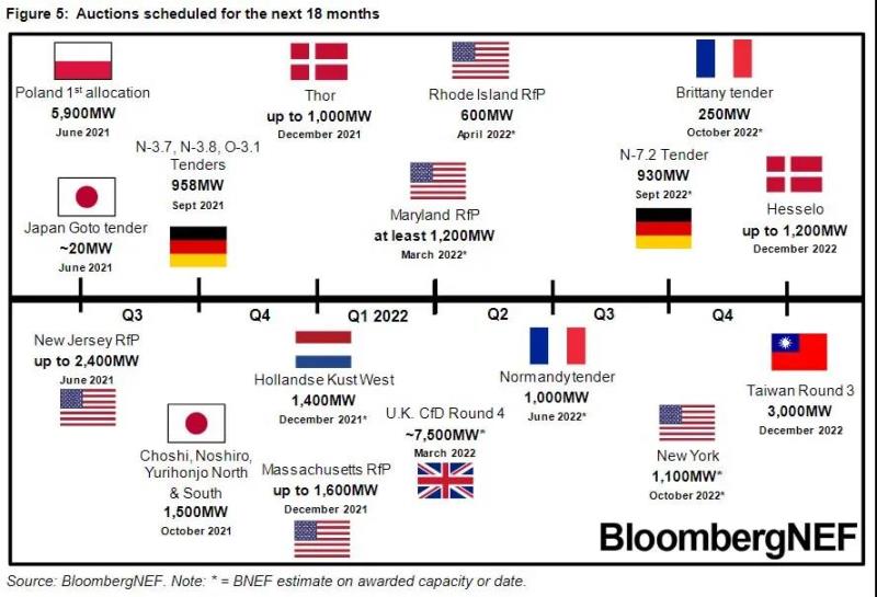 海上風電競價的公示不斷加速。德國的RWE贏得了丹麥的1GW Thor項目競價。德國則舉辦了全新中心化框架下的首次競價,項目容量為958MW。美國新澤西州在該國目前最大的一輪海上風電采購競價中批準新建近2.7GW的裝機容量,項目預計將在2025年至2030年間投產。