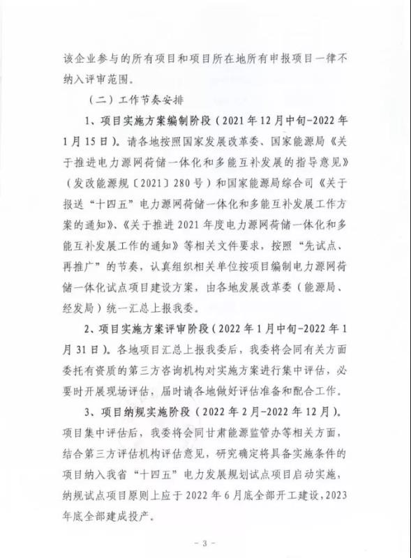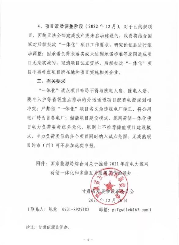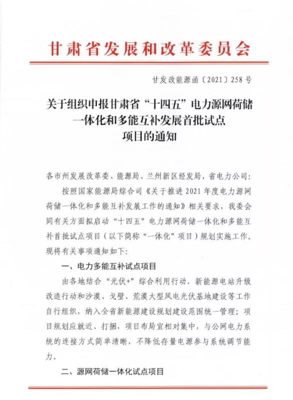 中國儲能網(wǎng)訊:12月20日,甘肅省發(fā)改委印發(fā)《關(guān)于組織申報(bào)“十四五”電力源網(wǎng)荷儲一體化和多功能互補(bǔ)發(fā)展首批試點(diǎn)項(xiàng)目的通知》,就項(xiàng)目申報(bào)有關(guān)事項(xiàng)給出具體指導(dǎo)。