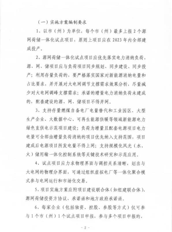 根據(jù)文件,電力多能互補(bǔ)試點(diǎn)由各地結(jié)合“光伏+”綜合利用行動、新能源電站升級改造和沙漠、戈壁、荒漠大型風(fēng)電光伏基地建設(shè)等工作自行組織。源網(wǎng)荷儲項(xiàng)目則以市(州)為單位,每個(gè)市最多可申報(bào)2個(gè)項(xiàng)目,原則上應(yīng)在2023年內(nèi)全部建成投產(chǎn)。每家企業(yè)僅可參與1市1個(gè)試點(diǎn)項(xiàng)目申報(bào)。