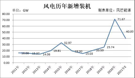 但是也有業(yè)內(nèi)人士持不同意見。有相關(guān)從業(yè)人士預估,2021年市場吊裝量在35-40GW。陸上風電同比下降30%-40%。