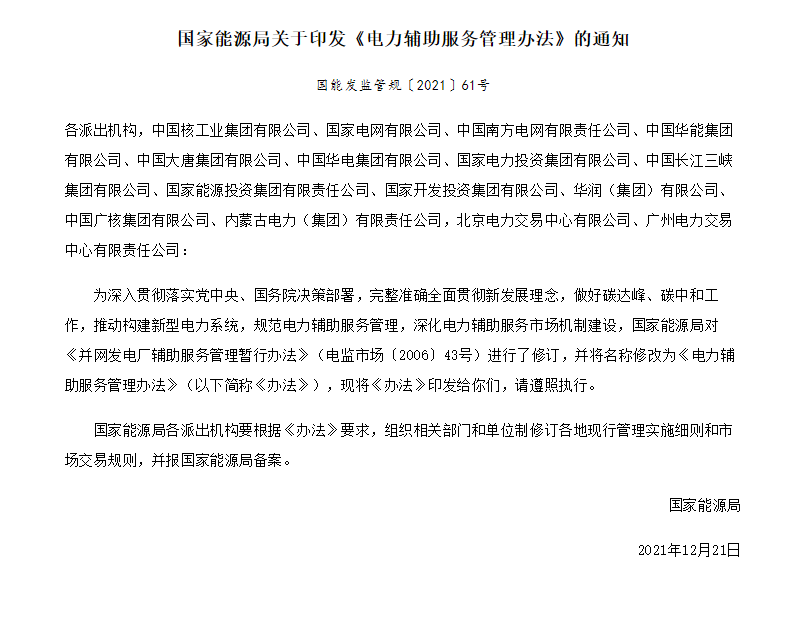 中國儲能網(wǎng)訊:12月24日,國家能源局正式發(fā)布《電力并網(wǎng)運行管理規(guī)定》和《電力輔助服務(wù)管理辦法》,時隔十五年,兩份文件的修訂發(fā)布,將開啟我國輔助服務(wù)市場頂層設(shè)計的新構(gòu)架。
