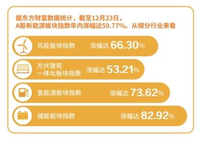 據(jù)東方財富數(shù)據(jù)統(tǒng)計,截至12月24日,A股新能源板塊指數(shù)年內(nèi)漲幅達(dá)54.27%,從細(xì)分行業(yè)來看,風(fēng)能板塊指數(shù)漲幅達(dá)62.66%,光伏建筑一體化板塊指數(shù)年內(nèi)漲幅達(dá)47.74%,氫能源板塊指數(shù)年內(nèi)漲幅達(dá)68.06%,儲能板塊指數(shù)漲幅達(dá)77.02%。
